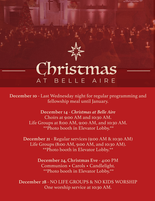 At Belle Aire, our mission is to glorify God by loving Jesus, sharing the gospel, and making disciples—and we would love for you to be a part of it. Whether you're new to the area, searching for a church home, or just curious about who Jesus is, you are always welcome here. From engaging worship and biblical teaching to meaningful community and opportunities to serve, there’s a place for you at Belle Aire. Take a look around our site to learn more, and we hope to see you soon!